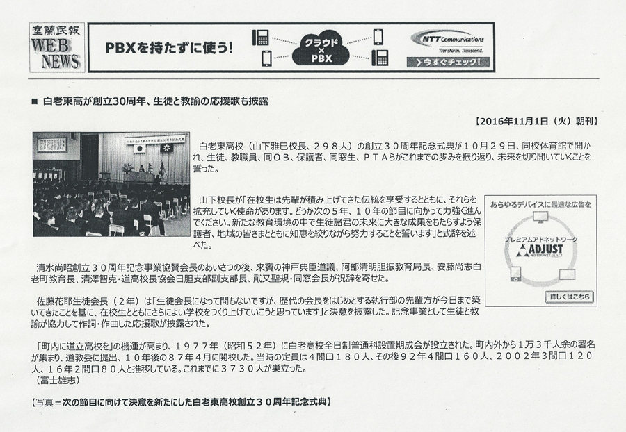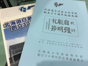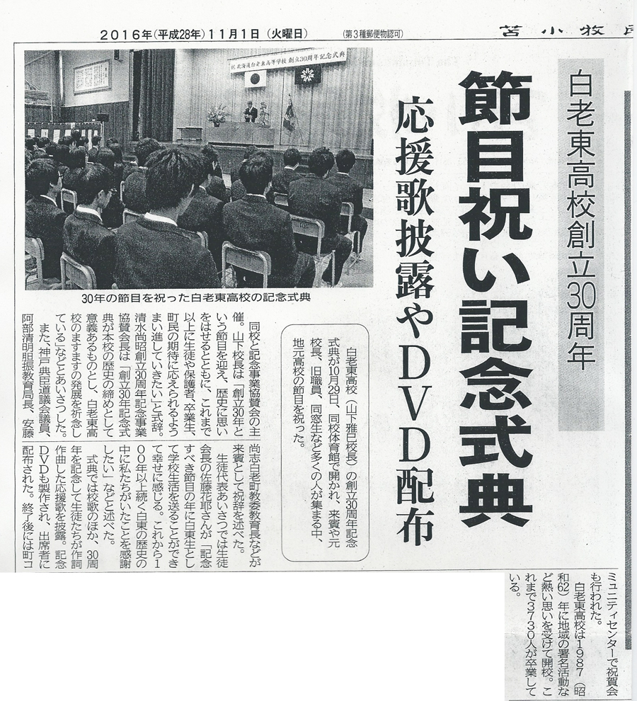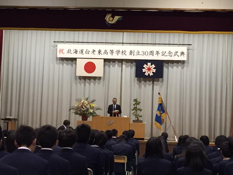記念事業 創立30周年記念式典が開催されました 平成28年10月29日、北海道白老東高等学校の創立30周年記念式典および祝賀会が開催されました。 記念事業協賛会の皆様、参加いただいた来賓の方々、卒業生の皆様、 たいへんありがとうございました。 ◎学校長式辞 ◎生徒会長挨拶 ◎協賛会長挨拶 ◎白老町長祝辞 ◎胆振教育局長祝辞 ◎同窓会長祝辞 苫小牧民報(2016.11.1) 室蘭民報(2016.11.1)